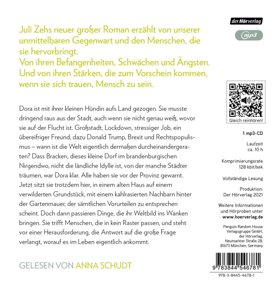 Der Bestseller von Juli Zeh zum Sonderpreis, gelesen von Anna Schudt Dora ist mit ihrer kleinen Hündin aufs Land gezogen. Sie musste dringend raus aus der Stadt, auch wenn sie nicht genau weiß, wovor sie auf der Flucht ist. Großstadt, Lockdown, stressiger Job,...