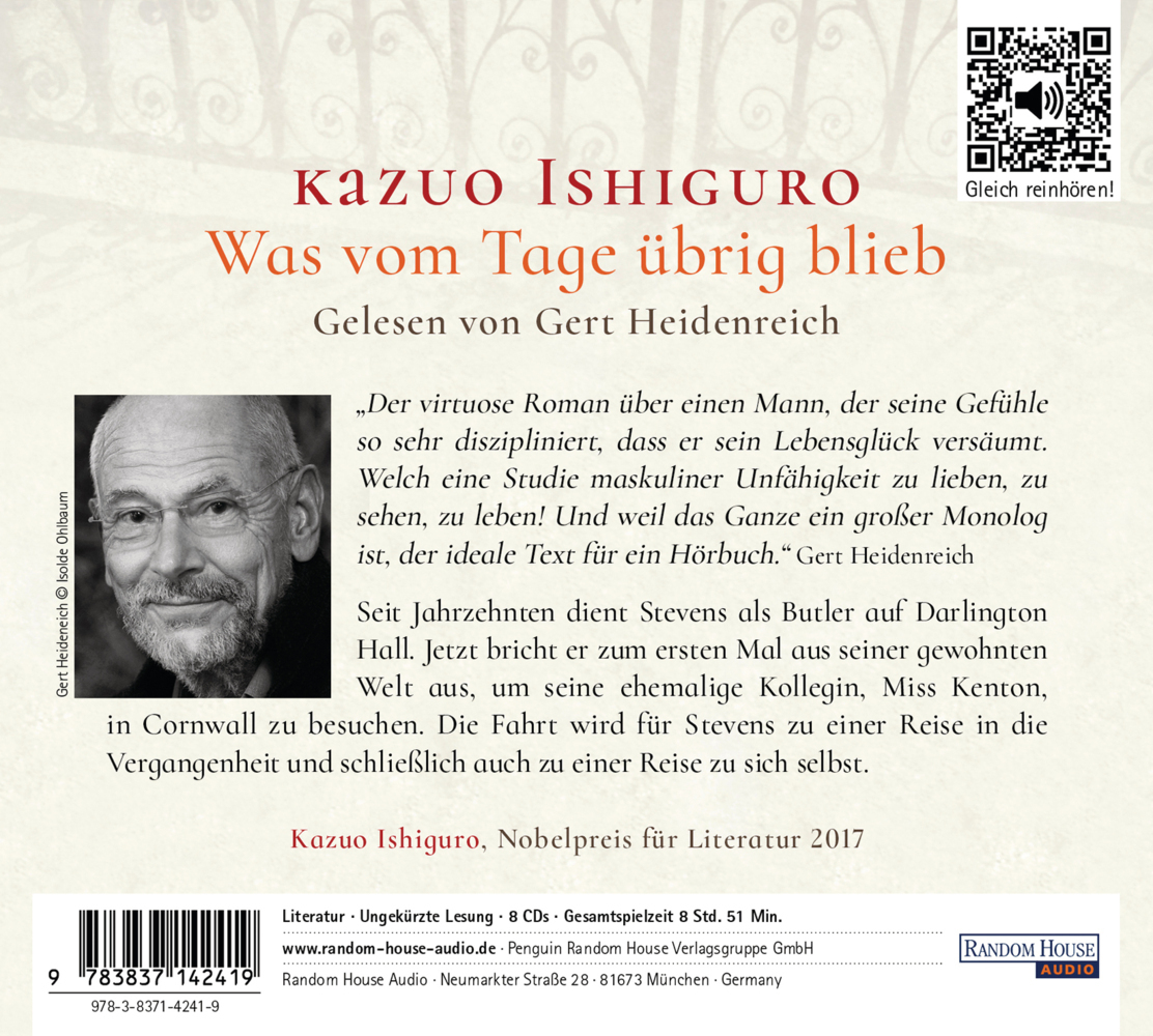 Ausgezeichnet mit dem Nobelpreis für Literatur 2017 Seit Jahrzehnten dient Stevens als Butler auf Darlington Hall. Er sorgt für einen tadellosen Haushalt und ist die Verschwiegenheit in Person: Er hat sein Leben voll und ganz in den Dienst seines Herrn gestell...