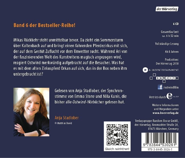 Ostwind-(6)Der Groe Orkan Stadlober,Anja Der Erfolgsritt geht weiter ... Band 6 der Bestseller-Reihe Mikas Rückkehr steht unmittelbar bevor. Da zieht ein Sommersturm über Kaltenbach und bringt einen fahrenden Pferdezirkus mit sich, der auf dem Gestüt Zuflucht ...| 1 | Ostwind - Der große Orkan | 00:11 | |