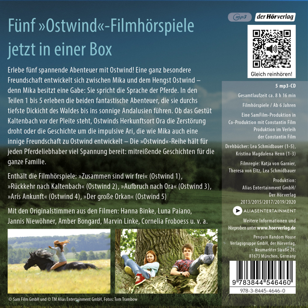 Erlebe fünf spannende Abenteuer mit Ostwind! Eine ganz besondere Freundschaft entwickelt sich zwischen Mika und dem Hengst Ostwind - denn Mika besitzt eine Gabe: Sie spricht die Sprache der Pferde. In den Teilen 1 bis 5 erleben die beiden fantastische Abenteuer, die sie durchs tiefste Dickicht des Waldes bis ins sonnige Andalusien bringen. Auch wenn das Gestüt Kaltenbach vor der Pleite steht, Ostwinds Herkunftsort Ora die Zerstörung droht oder die Geschichte um die impulsive Ari, die wie Mika auch eine innige Freundschaft zu Ostwind entwickelt Die Ostwind-Reihe hält für jeden Pferdeliebhaber viel Spannung bereit: mitreißende Geschichten für die ganze Familie.