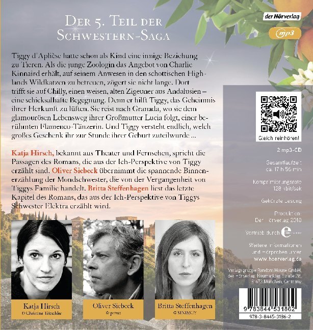 Der 5. Teil der Schwestern-Saga Tiggy d'Aplièse hatte schon als Kind eine innige Beziehung zu Tieren. Als die junge Zoologin das Angebot von Charlie Kinnaird erhält, auf seinem Anwesen in den schottischen Highlands Wildkatzen zu betreuen, zögert sie nicht...| 1 | Die Mondschwester | 00:00 | |