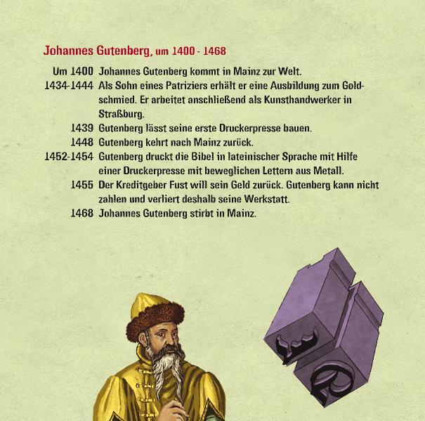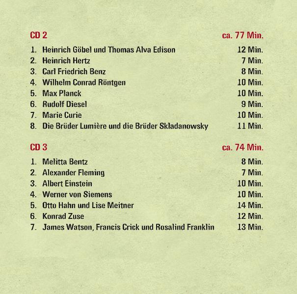 Unterhaltsam und informativ stellt diese erzählte Technikgeschichte bahnbrechende Erfindungen und ihre Entdecker vor: Man erfährt, wie Carl Benz das Auto entwickelte, was zur Erfindung des Dieselmotors führte, wie die Brüder Lumière die Bilder laufen lehrten, ...| 1 | Johannes Gutenberg | 07:43 | |