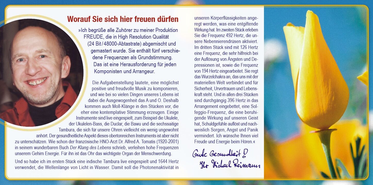 »Ich begruße alle Zuhörer zu meiner Produktion FREUDE, die in High Resolution Qualität (24 Bit/48000-Abtastrate) abgemischt und gemastert wurde. Sie enthält funf verschiedene Frequenzen als Grundstimmung. Das ist eine Herausforderung fur jeden Komponisten und Arrangeur. Die Aufgabenstellung lautete, eine möglichst positive und freudvolle Musik zu komponieren, und wie bei so vielen Dingen unseres Lebens ist dabei die Ausgewogenheit das A und O. Deshalb kommen auch Moll-Klänge in den Stucken vor, die eher eine kontemplative Stimmung erzeugen. Einige Instrumente sind live eingespielt, zum Beispiel die Ukulele, der Ukulelen-Bass, die Duclar, die Bawu und die sechssaitige Tambura, die sich fur unsere Ohren vielleicht ein wenig ungewohnt anhört. Der gesundheitliche Aspekt dieses obertonreichen Instruments ist aber nicht zu unterschätzen. Wie schon der französische HNO-Arzt Dr. Alfred A. Tomatis (1920-2001) in seinem wunderbaren Buch Der Klang des Lebens schrieb, verleihen hohe Frequenzen unserem Gehirn Energie. Fur ihn ist das Ohr das wichtigste Organ der Menschwerdung. Und so habe ich im ersten Stuck eine indische Tambura live eingespielt und 1644 Hertz verwendet, die Wellenlänge von Licht in Wasser. Damit soll die Photonenaktivität in unseren Körperflussigkeiten angeregt werden, was eine entgiftende Wirkung hat. Im zweiten Stuck erleben Sie die Frequenz 492 Hertz, die unsere Nebennierendrusen aktiviert. Im dritten Stuck sind mit 126 Hertz eine Frequenz, die sehr hilfreich bei der Auflösung von Ängsten und Depressionen ist, sowie die Frequenz von 194 Hertz eingearbeitet. Sie regt das Wurzelchakra an, das uns mit der materiellen Welt verbindet und fur Sicherheit, Urvertrauen und Lebenskraft steht. Und in allen drei Stucken sind durchgängig 396 Hertz in das Arrangement eingebettet, eine Solfeggio-Frequenz, die eine beruhigende Wirkung auf unseren Geist hat, Schuldgefuhle auflöst und nachweislich Sorgen, Angst und Panik vermindert. Ich wunsche Ihnen viel Freude und Energie beim Hören.« - Gute Gesundheit! Ihr Michael Reimann