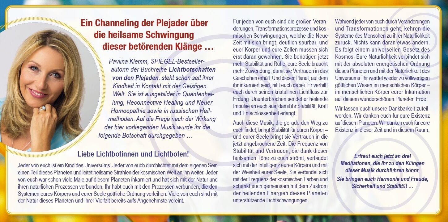 Pavlina Klemm, SPIEGEL-Bestsellerautorin der Buchreihe »Lichtbotschaften von den Plejaden«, steht schon seit ihrer Kindheit in Kontakt mit der Geistigen Welt. Sie ist ausgebildet in Quantenheilung, Reconnective Healing und Neuer Homöopathie sowie in russischen Heilmethoden. Auf die Frage nach der Wirkung der hier vorliegenden Musik wurde ihr die folgende Botschaft durchgegeben ...Liebe Lichtbotinnen und Lichtboten!Jeder von euch ist ein Kind des Universums. Jeder von euch durchlichtet mit dem eigenen Sein einen Teil dieses Planeten und leitet heilsame Strahlen der kosmischen Welt an ihn weiter. Jeder von euch war schon viele Male auf diesem Planeten inkarniert und hat sich mit der Natur und ihren natürlichen Prozessen verbunden. Ihr habt euch mit den Prozessen verbunden, die den Systemen eures Körpers und eurer Seele göttliche Ordnung verleihen. Viele von euch sind mit der Natur dieses Planeten und ihrer Vielfalt bereits aufs Angenehmste vereint.Für jeden von euch sind die großen Veränderungen, Transformationsprozesse und kosmischen Schwingungen, welche die Neue Zeit mit sich bringt, deutlich spürbar, und euer Körper und eure Zellen müssen sich erst daran gewöhnen. Sie benötigen jetzt mehr Stabilität und Ruhe, eure Seele braucht mehr Zuwendung, damit sie Vertrauen in das Geschehen erhält. Und dieser Planet, auf dem ihr inkarniert seid, hilft euch dabei. Er verhilft euch durch seinen kristallinen Lichtfluss zur Erdung. Ununterbrochen sendet er heilende Impulse an euch aus, damit ihr Stabilität, Kraft und Entschlossenheit erlangt.Auch diese Musik, die gerade den Weg zu euch findet, bringt Stabilität für euren Körper - und eurer Seele bringt sie Vertrauen in die jetzt angebrochene Zeit. Die Frequenz von Stabilität und Vertrauen, die dank dieser heilsamen Töne zu euch strömt, verbindet sich mit der Intelligenz eures Körpers und mit der Weisheit eurer Seele. Sie verbindet sich mit der Frequenz der kosmischen Farben und schenkt euch gemeinsam mit dem Zustrom der heilenden Energien dieses Planeten unterstützende Lichtschwingungen.Während jeder von euch durch Veränderungen und Transformationen geht, kehren die Systeme des Menschen zu ihrer Natürlichkeit zurück. Nichts kann daran etwas ändern. Es folgt einem universellen Gesetz des Kosmos. Eure Natürlichkeit verbindet sich mit der absoluten energetischen Ordnung dieses Planeten und mit der Natürlichkeit des Universums. Ihr werdet wieder zu vollwertigen göttlichen Wesen im menschlichen Körper - im menschlichen Körper eurer Inkarnation auf diesem wunderschönen Planeten Erde.Wir lassen euch unsere Dankbarkeit zuteilwerden. Wir danken euch für eure Existenz auf diesem Planeten. Wir danken euch für eure Existenz in dieser Zeit und i…