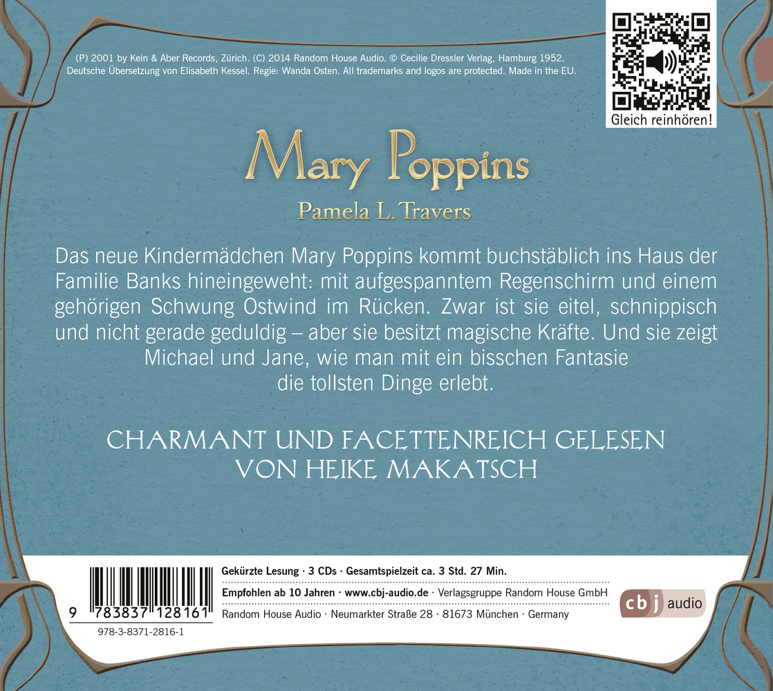 Das neue Kindermädchen Mary Poppins kommt buchstäblich ins Haus der Familie Banks hineingeweht: mit aufgespanntem Regenschirm und einem gehörigen Schwung Ostwind im Rücken. Zwar ist sie eitel, schnippisch und nicht gerade geduldig - aber sie besitzt magische K...| 1 | Pamela L. Travers: Mary Poppins | 16:02 | |