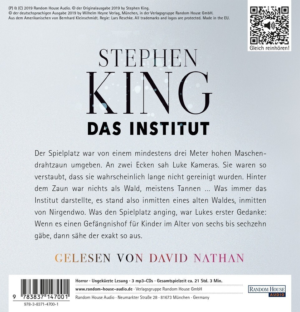 Der neue große Stephen King In einer ruhigen Vorortsiedlung von Minneapolis ermorden zwielichtige Endringlinge lautlos die Eltern von Luke Ellis und verfrachten den betäubten Zwölfjährigen in einen schwarzen SUV. Die ganze Operation dauert keine zwei Minuten. ...| 1 | Stephen King: Das Institut [Part 1] | 00:00 | |