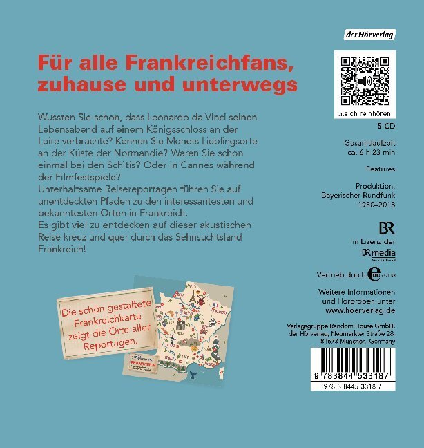 Unterhaltsame Reisereportagen führen Sie auf unentdeckten Pfaden zu den interessantesten und bekanntesten Orten in Frankreich. Es gibt viel zu entdecken auf dieser akustischen Reise kreuz und quer durch das Sehnsuchtsland Frankreich! In Retro-Geschenkausstattung mit großer Frankreichkarte.