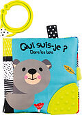 Un livre en tissu avec des illustrations d'animaux, un anneau de dentition et un coin en plastique pour permettre au tout-petit de faire ses dents, et des onglets à manipuler.