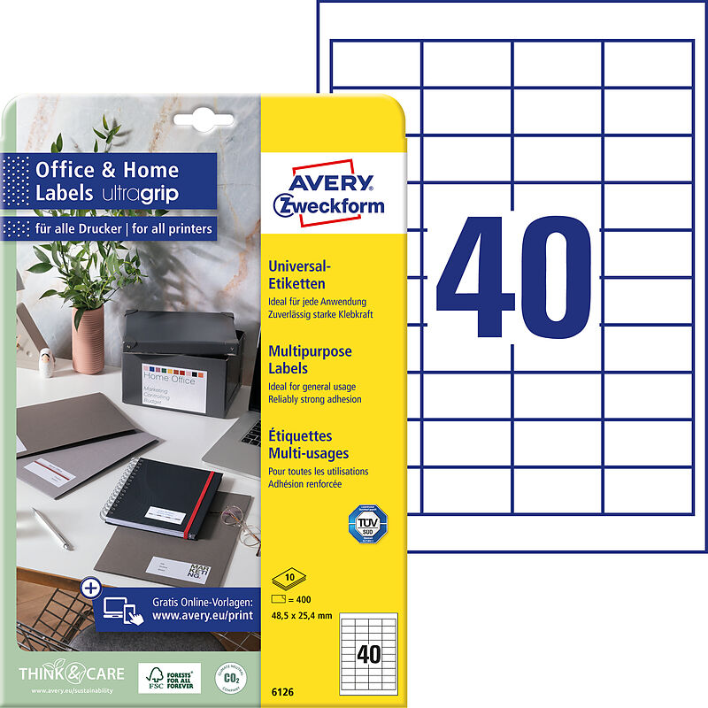 Universal-Etiketten mit ultragrip Qualität vom Etiketten-Experten: die weissen Universal-Etiketten 6126 im Format 48,5 x 25,4 mm von Avery Zweckform haften mit starker permanenter Klebkraft absolut zuverlässig auf Papier, Karton, Glas und vielen gängigen Kuns...
