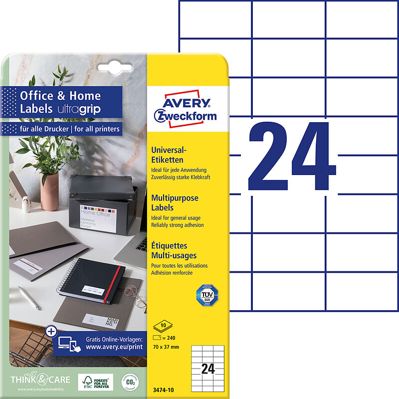 ULTRAGRIP - Universaletiketten weiss - 10 Bogen A4 Qualität vom Etiketten-Experten: die weissen Universal-Etiketten 3474-10 im Format 70 x 37 mm von Avery Zweckform haften mit starker permanenter Klebkraft absolut zuverlässig auf Papier, Karton, Glas und viel...