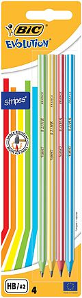 Holzfreier Bleistift, aus Kunstharz gefertigt. Robuste und widerstandsfähige Mine, geschützt von einer lackierten Resin-Ummantelung. Kaubeständig und sicher: kein Splittern bei gewaltsamem Bruch. Durchgefärbter, sechskantiger Schaft mit Streifendesign in 4 Var...