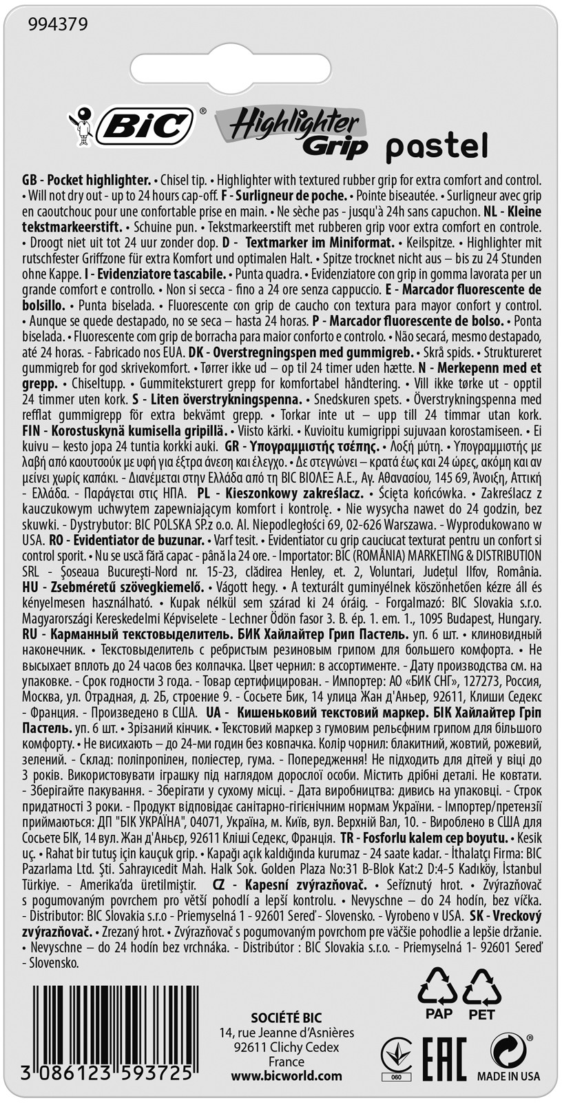 HIGHLIGHTTER PASTEL - Textmarker Textmarker BiC Highlighter Grip Pastel 1.5mm-3.5mm. Mit Pastell-Farben auf Wasserbasis. Mittlerer Schaft mit Kappe und Clip in Tintenfarbe und grauem Antirutsch-Gummigriff. Sicherheits-Kappe mit hörbarem Klick zur Verschluss-K...
