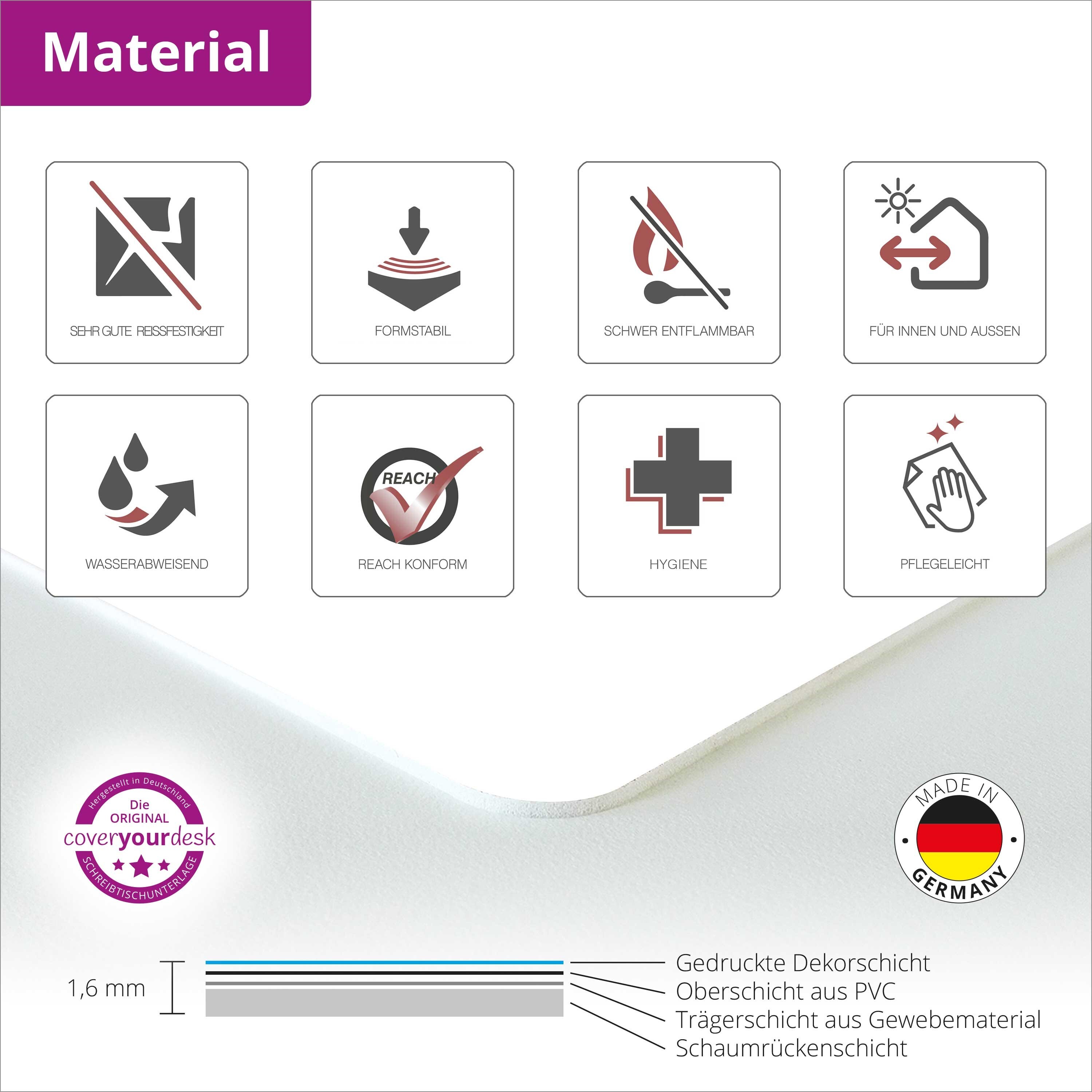 Unsere abwaschbaren Schreibtischunterlagen aus hochwertigem premium Vinyl überzeugen durch exzellentes Material und tolle Fotodruckqualität. Das 1,6 mm dicke Vinyl mit rutschhemmender Unterseite schützt deinen Schreibtisch zuverlässig vor Verschmutzungen und N...