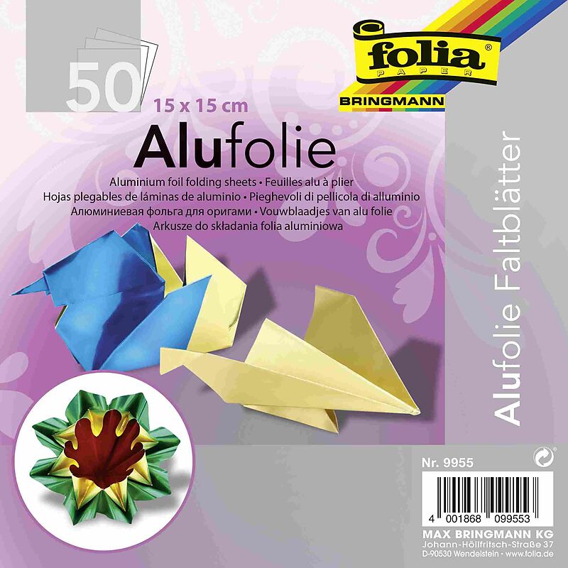 Faltblätter aus Alufolie im Format 15x15cm, 50 Blatt, silber, gold, rot, blau, grün, Papierkern mit Alufolie kaschiert Faltblätter aus Alufolie sind nicht nur zu Weihnachten schön sondern das ganze Jahr über ein echter Hingucker, die Alufolie bleibt sehr forms...