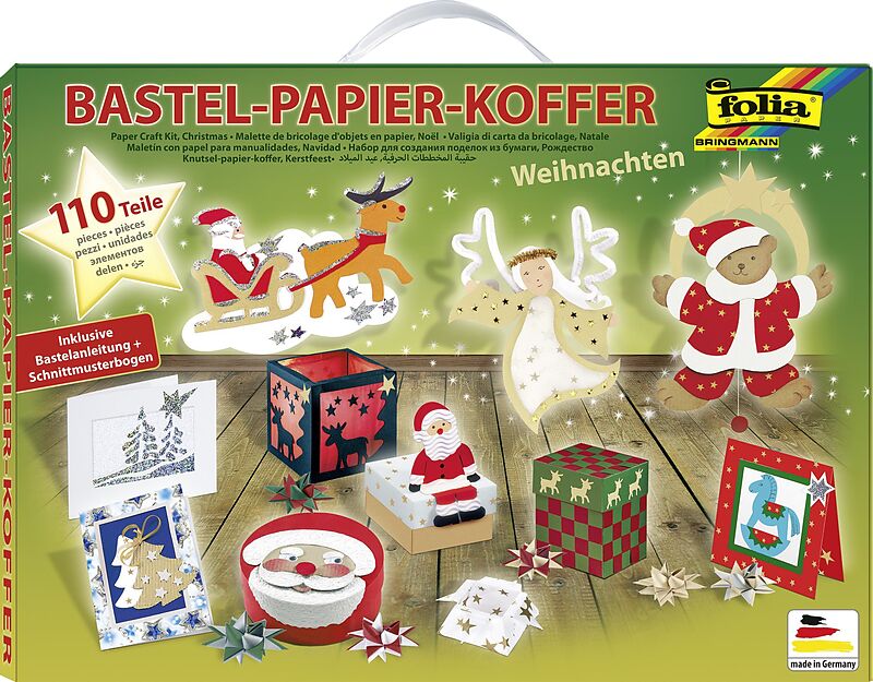 Sie erhalten einen 110 teiligen Bastelkoffer zum Thema Weihnachten. Der Koffer ist mit Bastelbeispielen bedruckt und hat einen Plastiktragegriff. Der Koffer ist mit vielen verschiedenen Papiersorten und Dekoelementen passend zur Advents- und Weihnachtszeit bes...