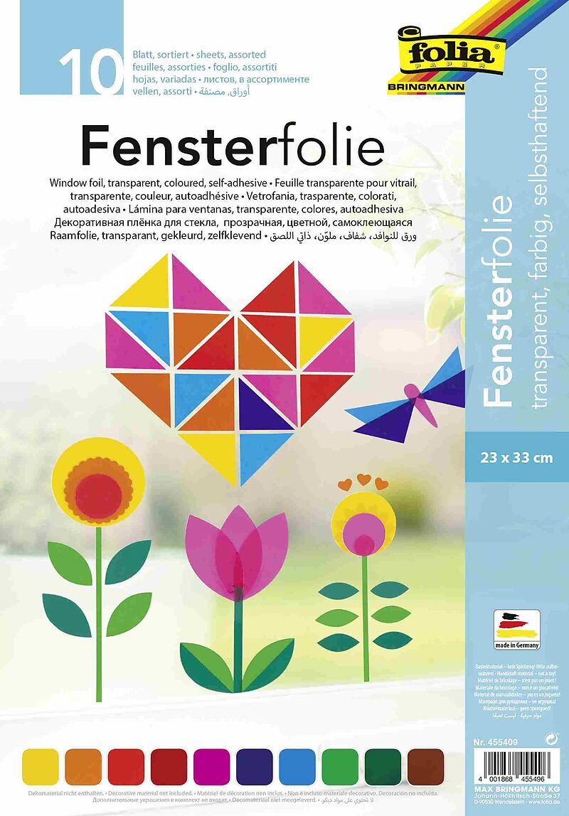 10 Blatt farbig sortierte Fensterfolie in 23x33cm, je 1x gelb, orange, hochrot, dunkelrot, pink, hellblau, dunkelblau, hellgrün, dunkelgrün, schokobraun, Folienstärke 150 g/qm, verpackt im Beutel mit 4-farbig bedrucktem Deckblatt Mit der Fensterfolie können wu...