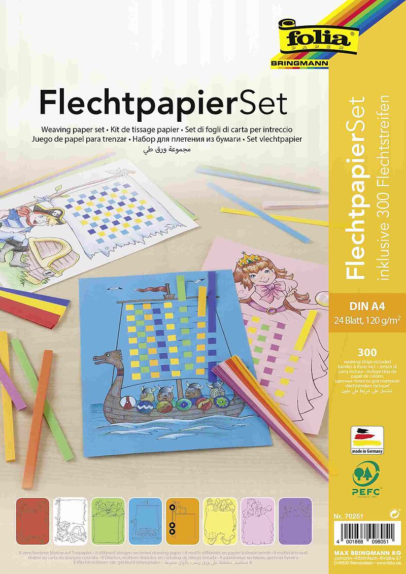Flechtpapier Set, 24 Flechtbögen im Format DIN A4, 120 g/m, in 8 Farben und 8 Motiven sortiert, inkl. 190 Flechtstreifen, verpackt im Polybeutel mit 4 farbigem Einleger, LGA tested, PEFC zertifiziert, Made in Germany Mit dem Felchtpapier-Set können auch bereit...