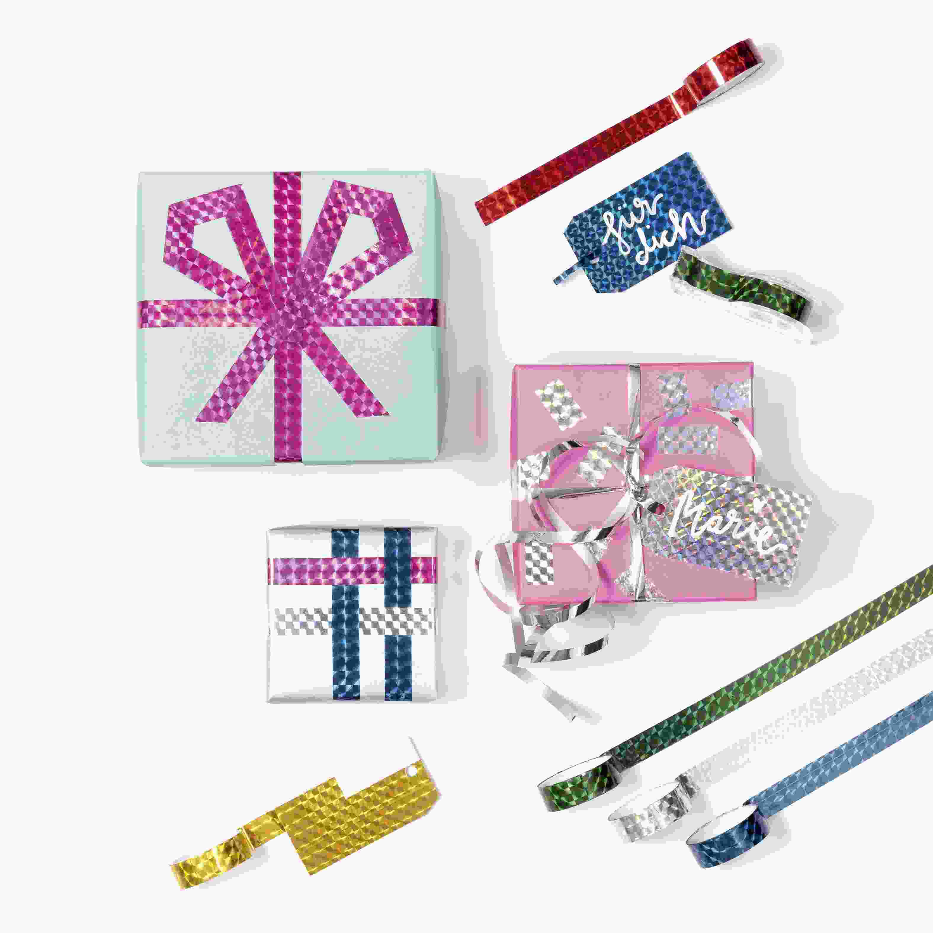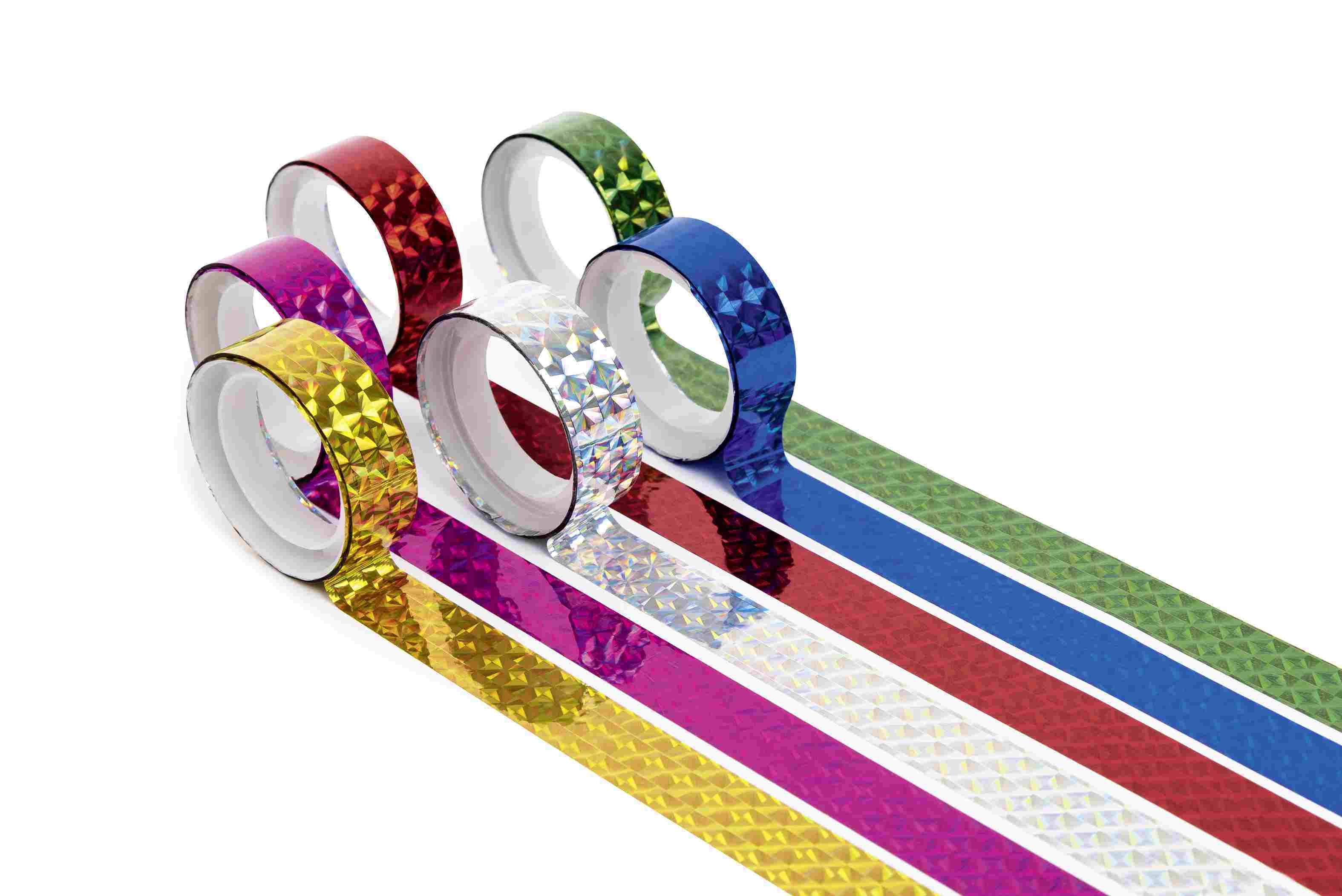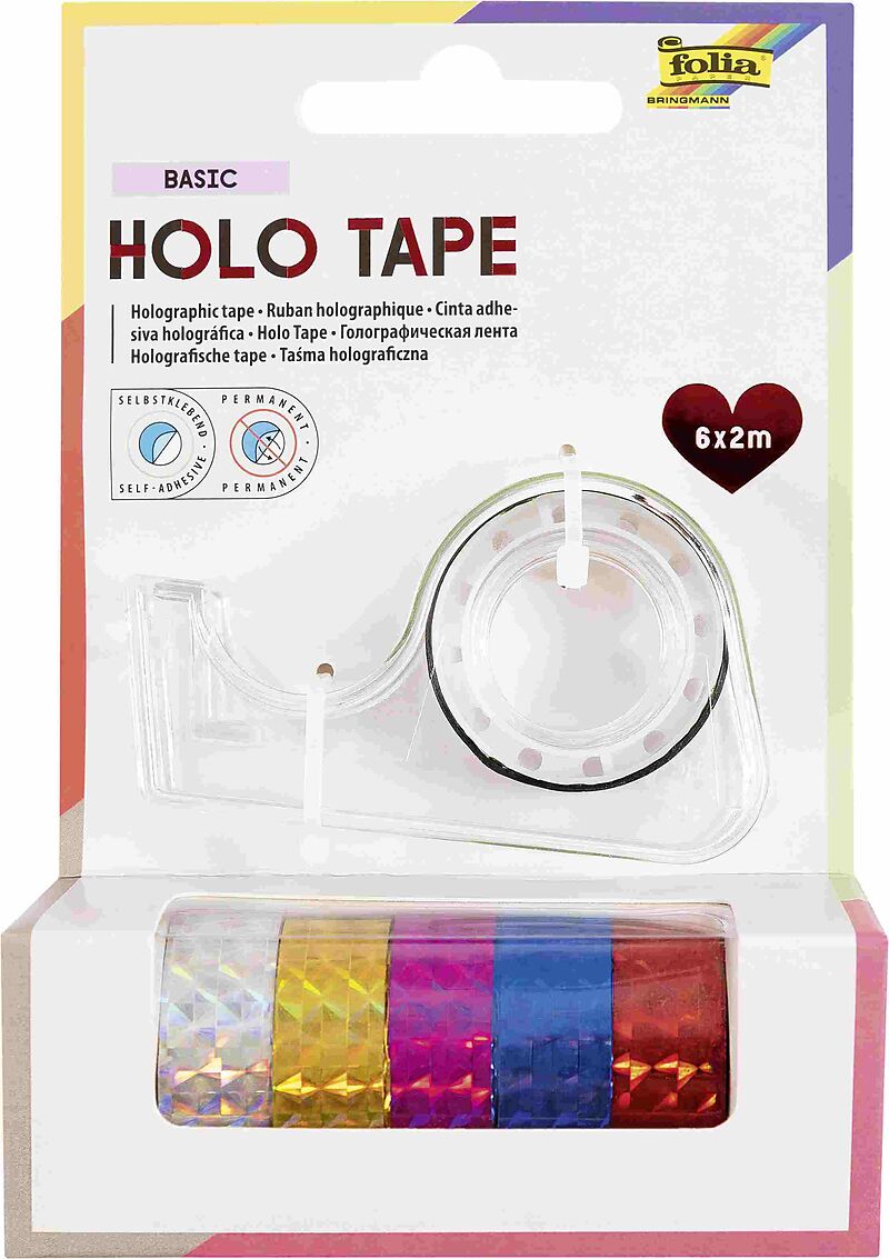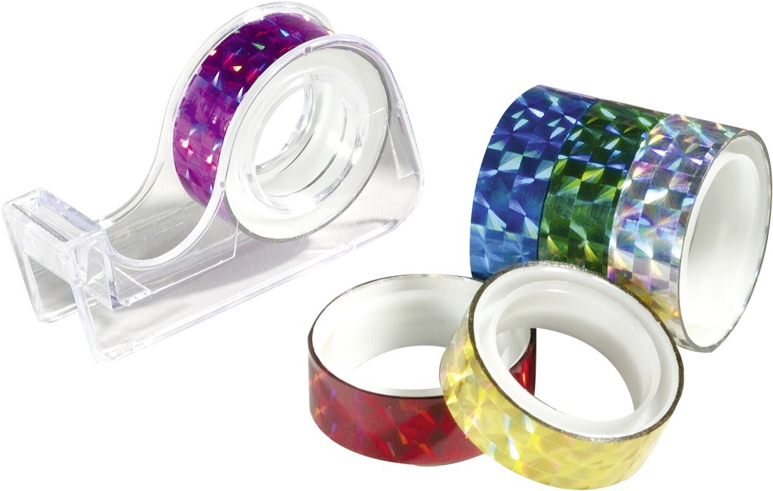 4-farbig bedruckte Blisterkarte mit Euroloch, 6 Rollen holographischer Selbstklebefilm 12mm x 2m, inkl. Abroller, selbstklebend Holographischer Selbstklebefilm, 12mmx2m, 6 Rollen, farbig sortiert, inkl. Klebebandspender. Zum Verzieren und Gestalten von Geschen...