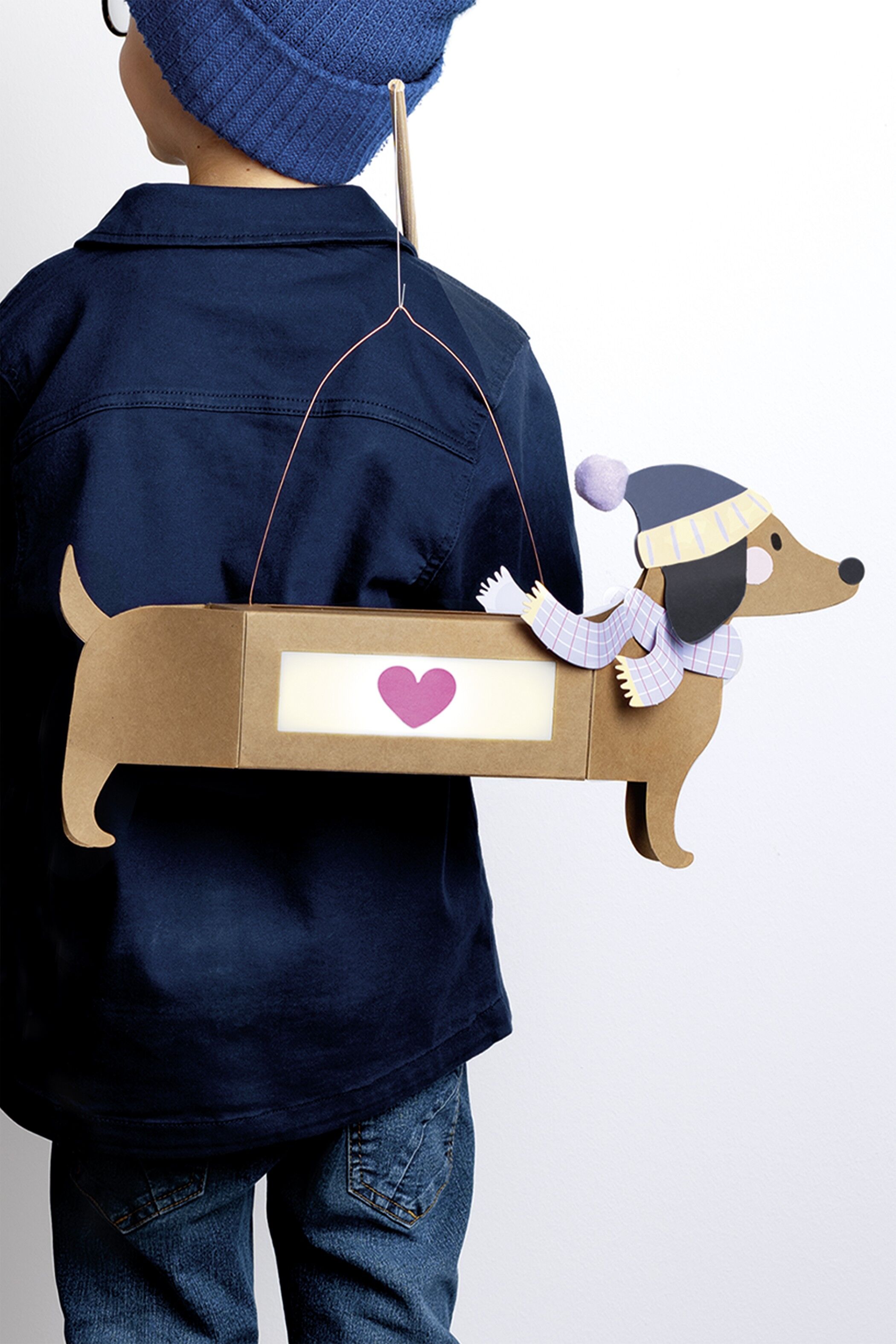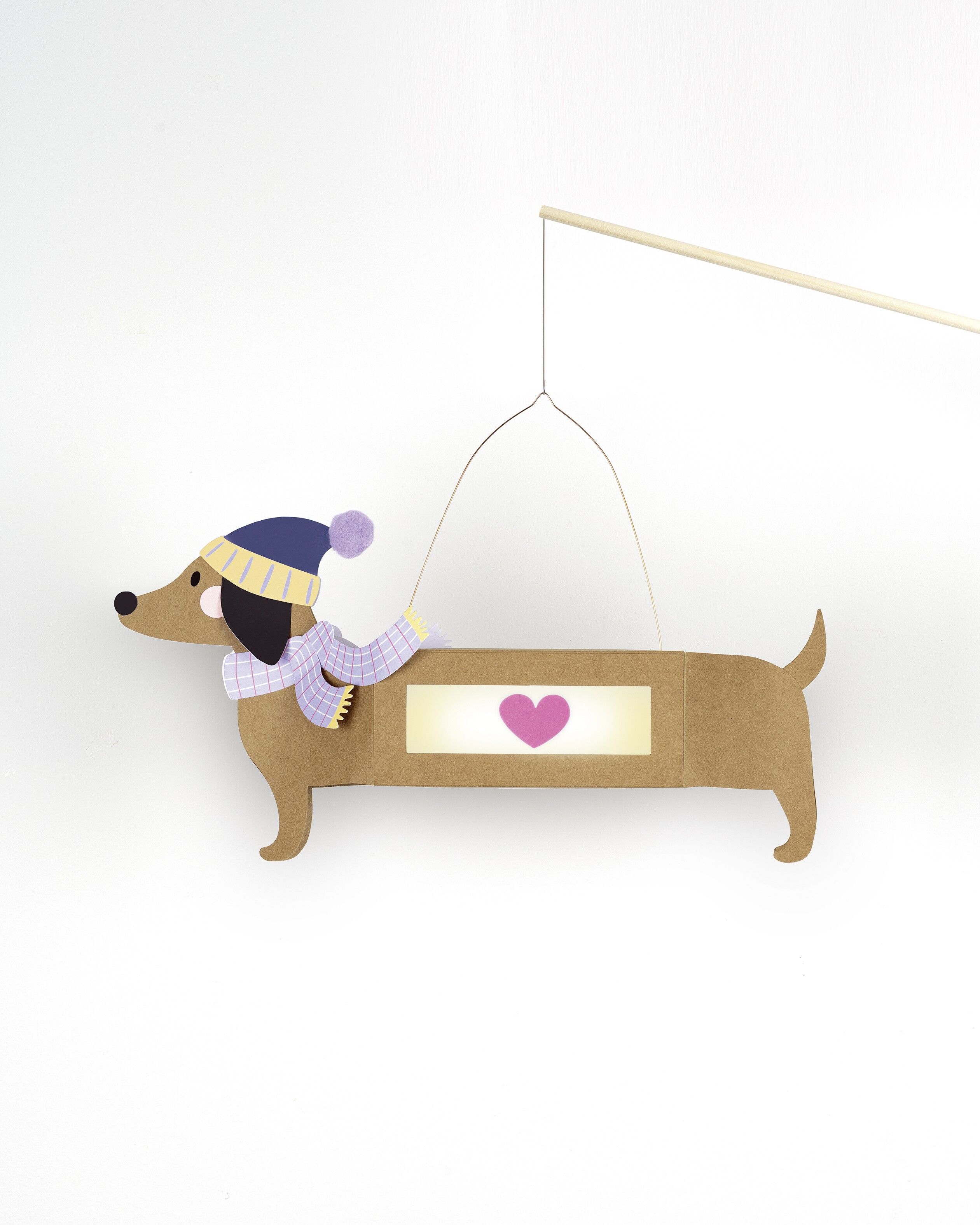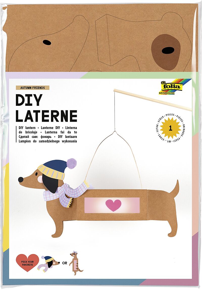 Bastelset für 1 Laterne mit zwei Motiven kombinierbar; Dackel und/oder Dackel inkl. Anleitung; Laternen-Rohling, eckig, natur; 2 x Stanzbogen 4/4-farbig bedruckt; mit Veredelung, 23 x 33 cm; 2 x Transparentpapier-Zuschnitte, weiß, 7,5 x 18 cm; 1x Pompon, hellb...