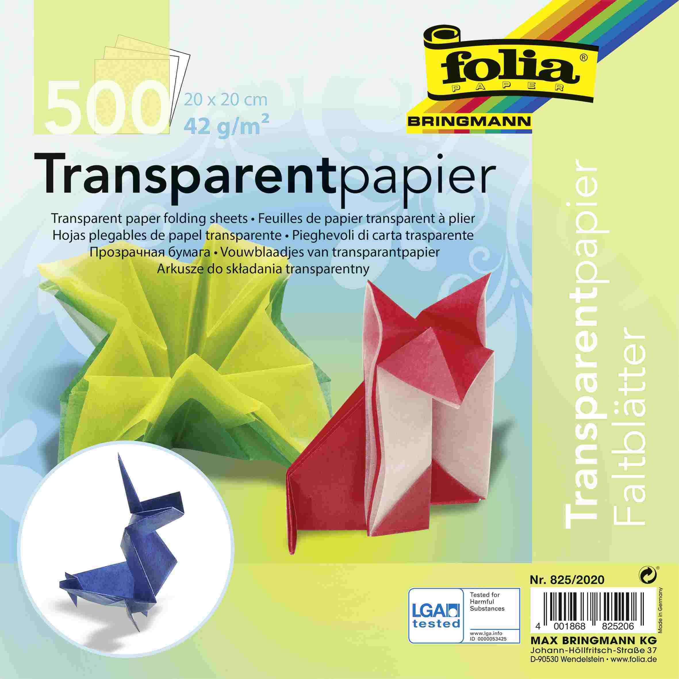 Farbig sortierte Faltblätter aus Transparentpapier, Format 20x20 cm, Inhalt: 500 Blatt sortiert in 10 verschiedenen Farben, Qualität 42 g/qm, LGA tested, eingeschweißt in Folie mit 4-farbig bedrucktem Deckblatt Farbig sortierte Faltblätter aus Transparentpapie...