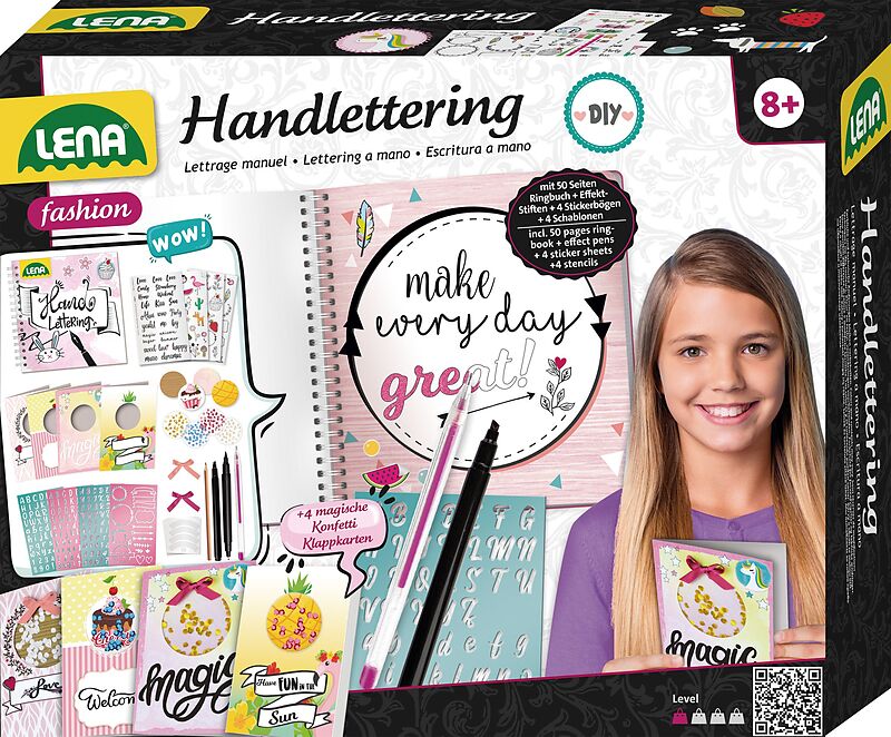 Handlettering LENA® Handlettering, groß, Ringbuch und Karten mit Fotos, Ausschnitten sowie vor allem Sprüchen und Skizzen im trendigen Handlettering Style selbst gestalten. Set enthält 2 schwarze Stifte - einer davon mit 2 Spitzen, einen Glitzerstift, einen Bl...