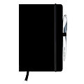 Holzfreies Papier, 80g/m creme, 96 Blatt, kariert, Leseband, Bezug Kunstleder schwarz, Stiftelasche mit Gummizug zum Verschließen mit 16 herausreißbaren Blättern mit Falttasche hinten.