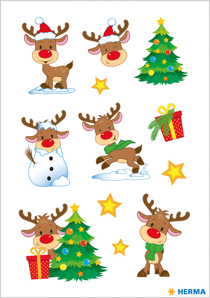 Selbstklebende Schmucketiketten bunt bedruckt mit Weihnachtsmotiven.