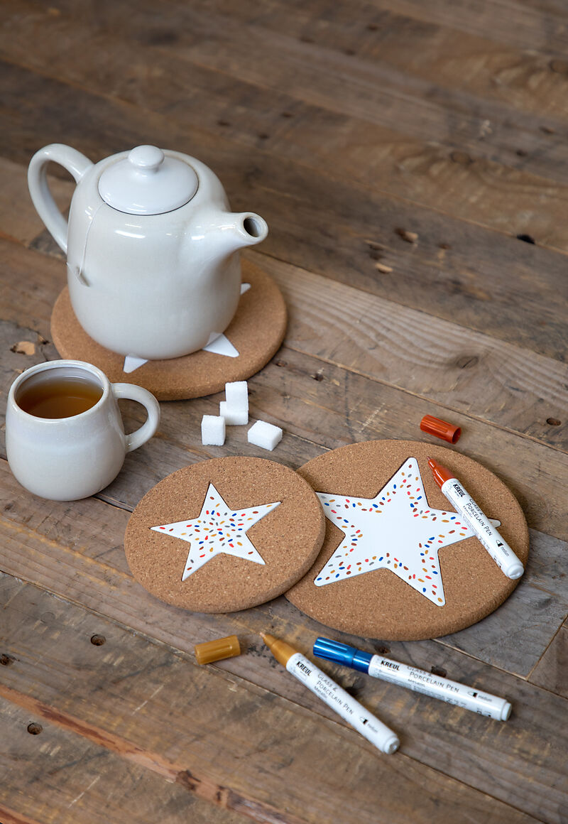 Korkuntersetzer Die Korkuntersetzer können mit unterschiedlichen Techniken verschönert werden. Die Porzellanplatte in der Mitte lässt sich entfernen, z.B. für das Einbrennen der Porzellanfarbe im Backofen oder dem Reinigen. Es kann leicht mit Porzellan- und G...
