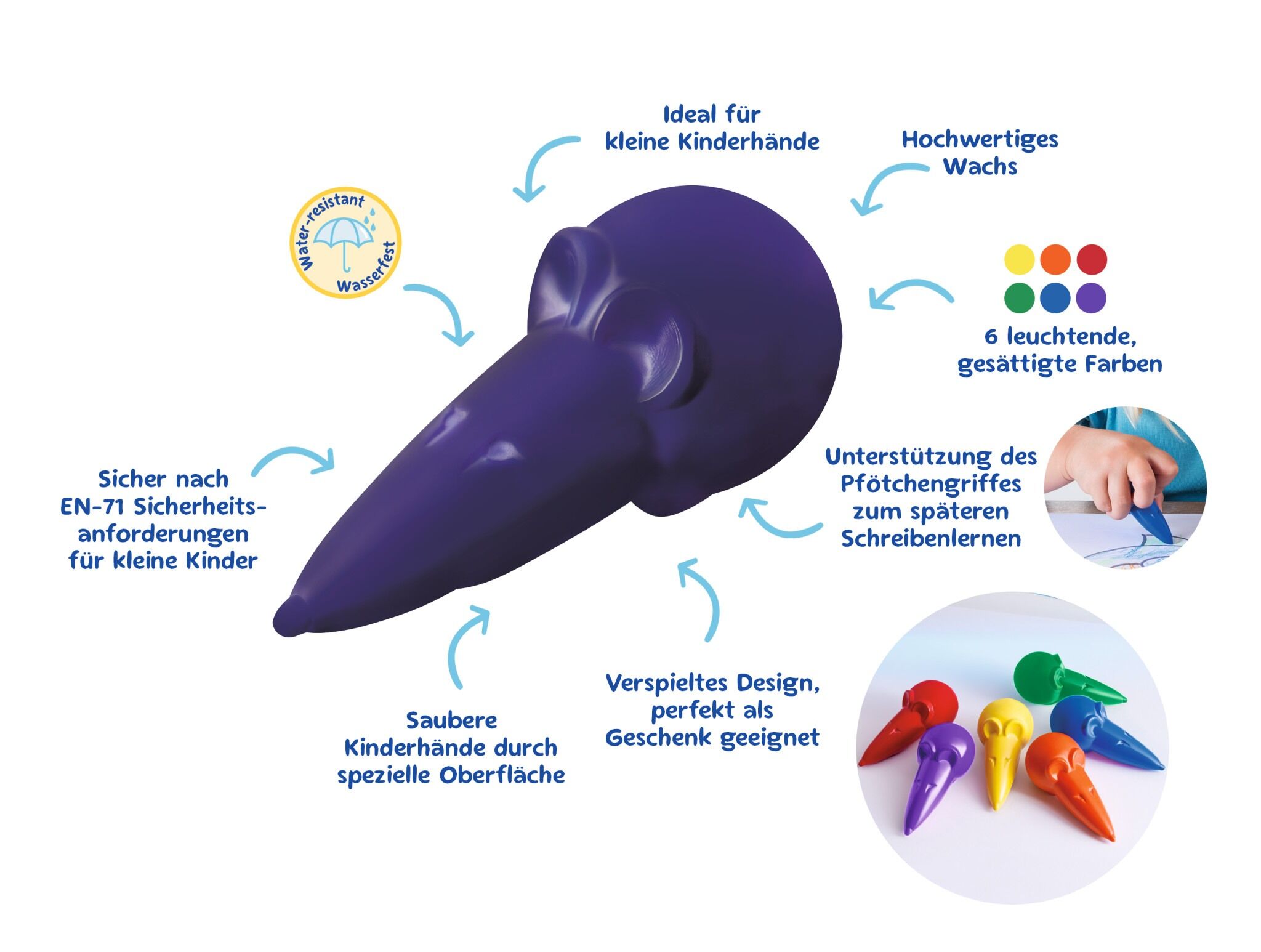 Wachsmalmäuse Malen unterstützt die kreative Entwicklung der Kinder, gleichzeitig wird ihre Konzentrationsfähigkeit geschult. Die Wachsmalmäuse fördern durch ihre besondere Form motorische Fähigkeiten. Bei den ersten Malversuchen unterstützen die Wachsmalmäus...