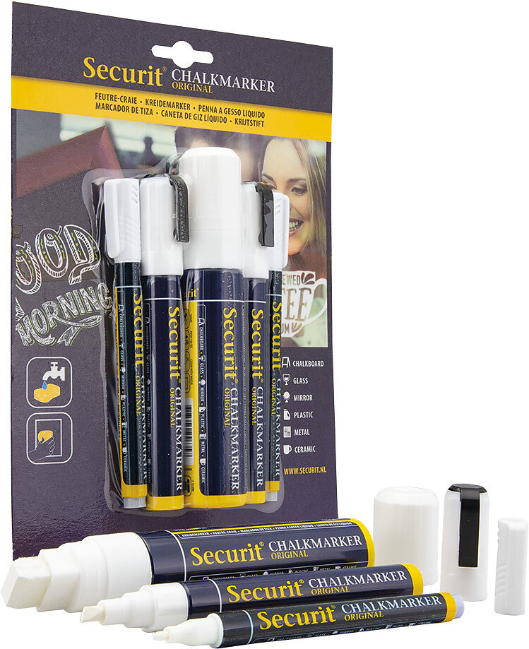 Kreidestifte Hochwertige, flüssige Kreidestifte, schmutzresistent und lassen sich (wenn getrocknet) nicht verwischen. Mit einem feuchten Tuch oder Securit Reiniger wieder leicht zu entfernen. Schreibt auf allen nicht-porösen Oberflächen wie Kreidetafeln, Glas...