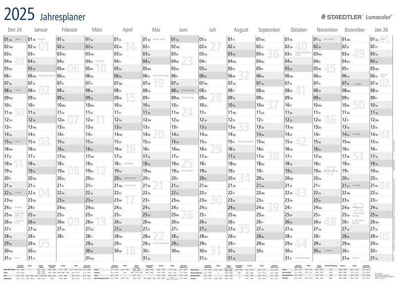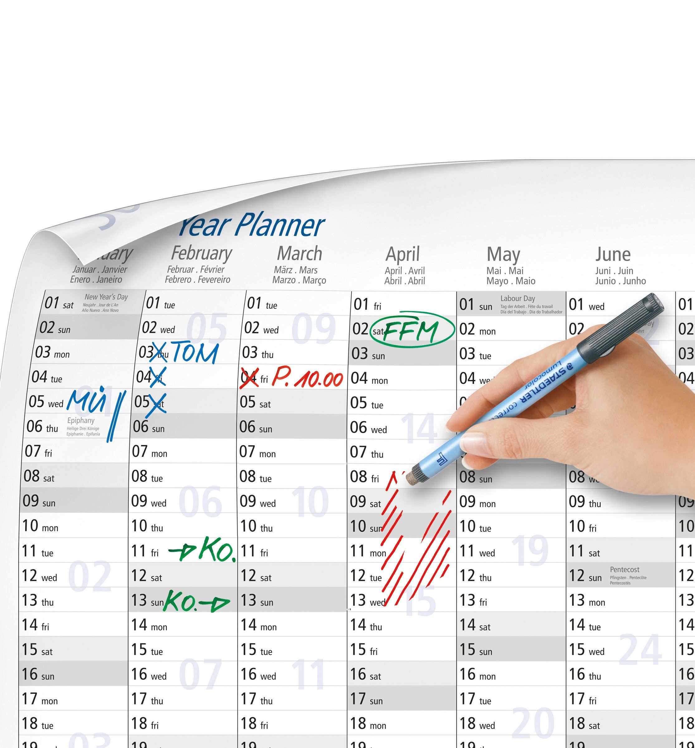 1 Lumocolor Jahresplaner 2025 (Kalender mit 14 Monaten), abwischbar und 1 Lumocolor correctable Folienstift, schwarz. Ausführung der Kalenderaufteilung: 14 Monate/1 Seite. Druckfarbe: blau, schwarz. Wochenzählung vorhanden. Ausführung der Sprachauswahl: deutsc...
