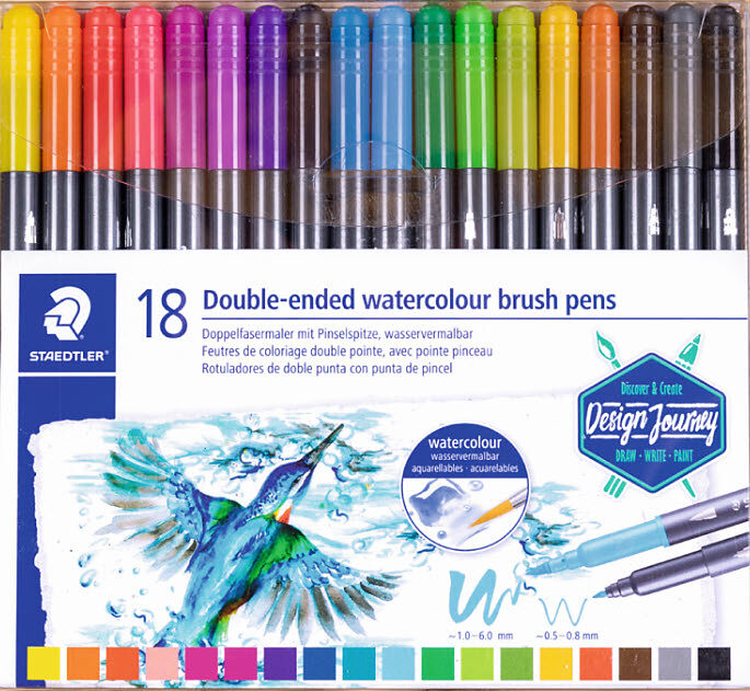 Ein Stift - zwei Spitzen; eine flexible Pinselspitze und eine feine Spitze; Für Aquarell-Effekte auf den meisten Aquarellpapieren ; Linienbreite Pinselspitze ca; 1,0 - 6,0 mm, Linienbreite feine Spitze ca; 0,5 - 0,8 mm; Erhältlich in 36 Farben;