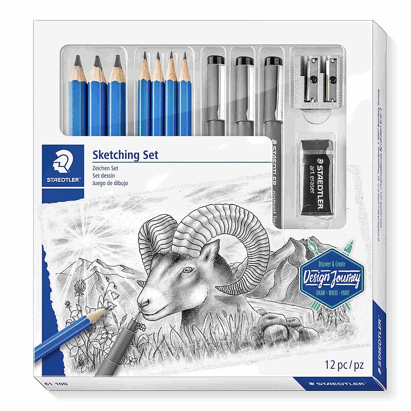 Kartonetui mit 7 Zeichenbleistiften in sortierten Härtegraden, 3 pigment liner in sortierten Linienbreiten, 1 Radierer und 1 Metalldoppelspitzer: - Hochwertiger Zeichenbleistift - Spezielle Minenrezeptur für glänzende Schattierungen in den verschiedensten Grau...