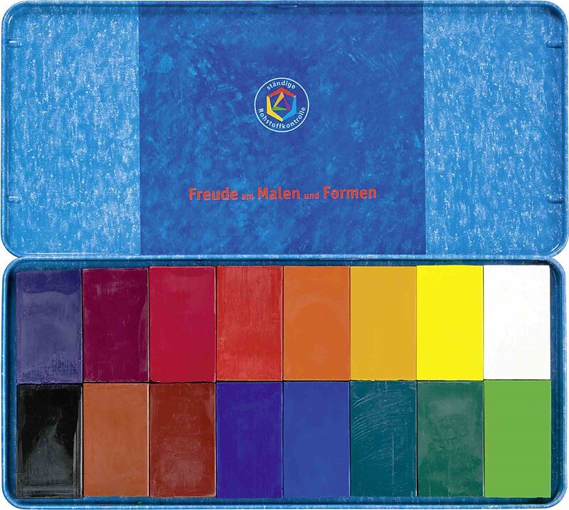 Wachsmalblöcke; Inhalt: 16 Blöcke im Blechetui; mit Bienenwachs und giftfreien lichtechten Farbpigmenten; wasserfest.
