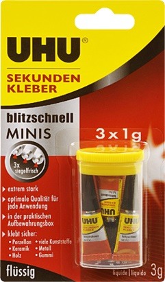 Sekundenkleber blitzschnell Minis Extrem starker Sekundenkleber- portioniert in 1 g Tuben, in der praktischen Aufbewahrungsbox. Optimale Qualität für jede Anwendung- 3x siegelfrisch. Aufgrund seiner Konsistenz fließt der Klebstoff in kleinste Ecken und Spalte...