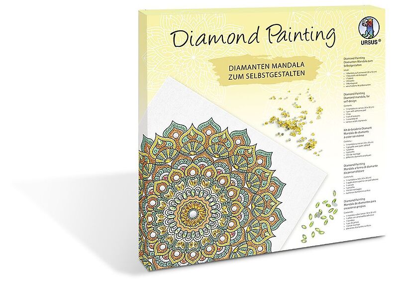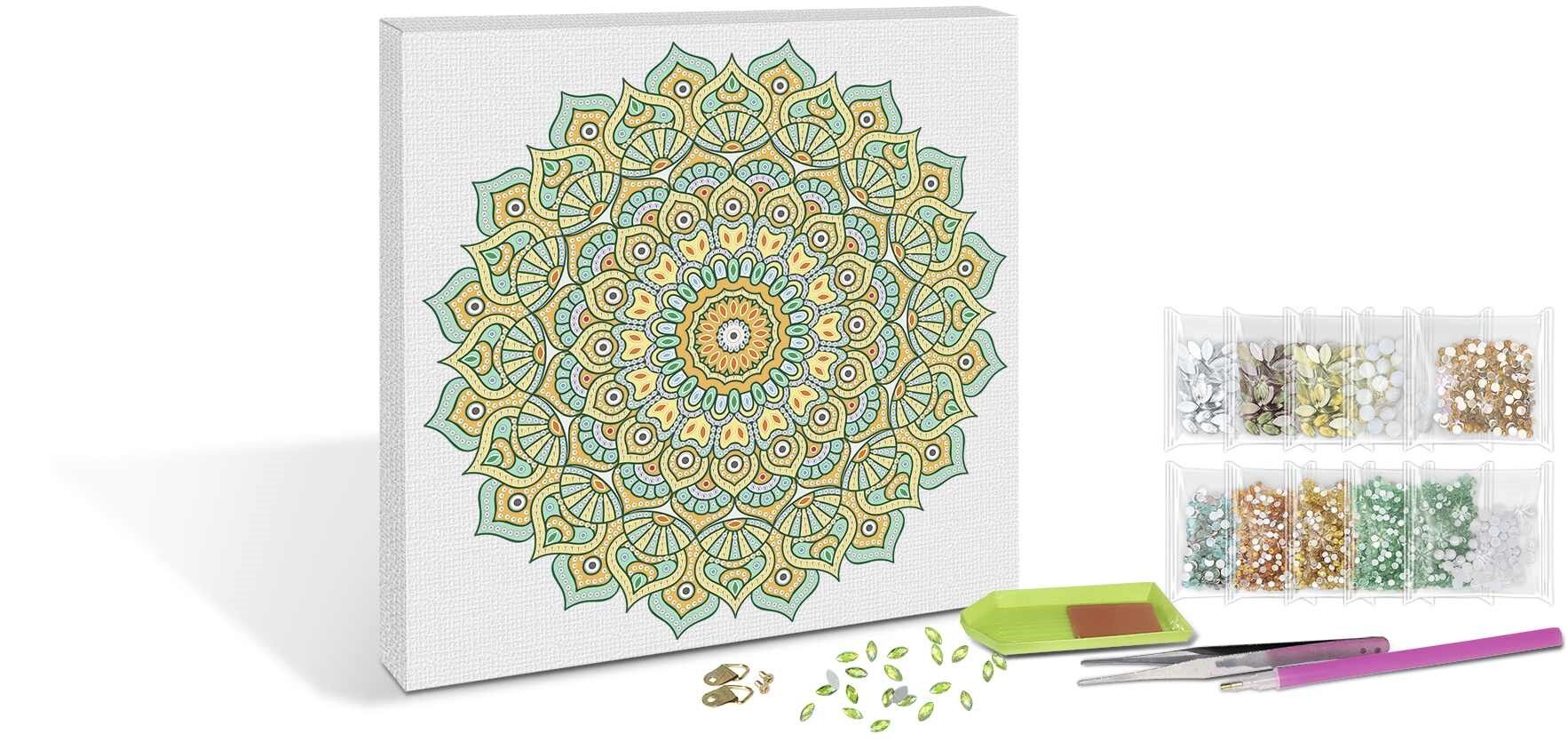 1 Mandala auf Leinwand (30 x 30 x 1,5 cm), 1 Steckstift mit Klebepad, 1 Tablett, 1 Pinzette, 1 Montageset und verschiedene Acryldiamanten.