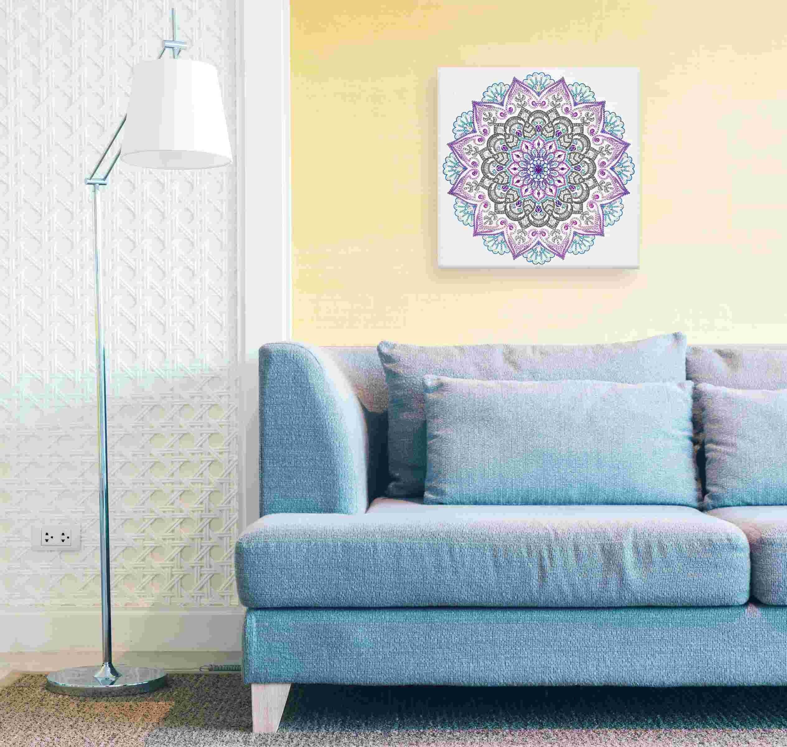 Diamanten Mandala zum Selbstgestalten in den Farben Türkis, Lila und Anthrazit 1 Mandala auf Leinwand (30 x 30 x 1,5 cm), 1 Steckstift mit Klebepad, 1 Tablett, 1 Pinzette, 1 Montageset und verschiedene Acryldiamanten.