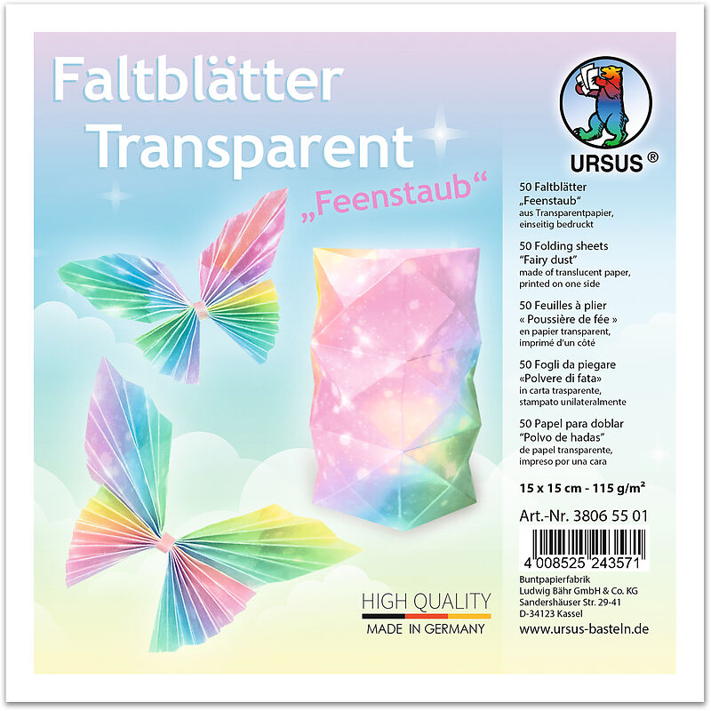 50 Faltblätter aus Transparentpapier (115 g/m, Format: 15 x 15 cm, Design "Feenstaub", einseitig bedruckt) - "Made in Germany"