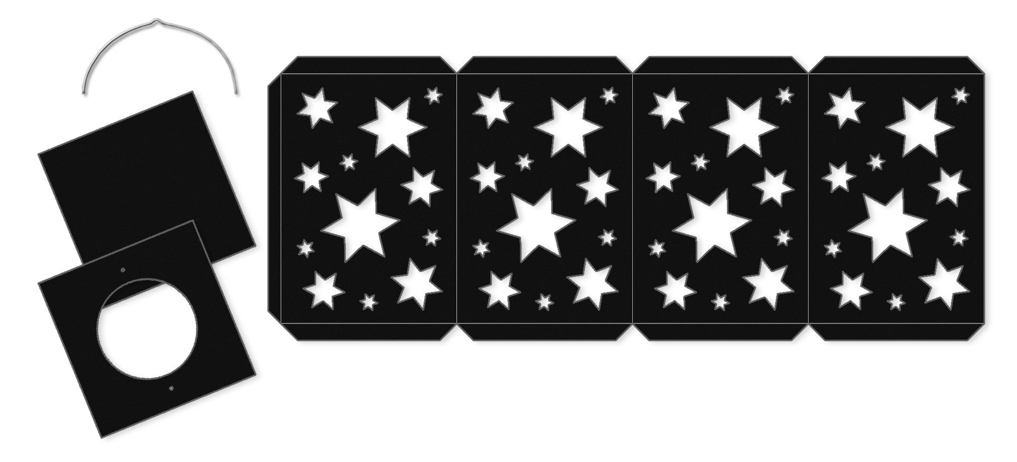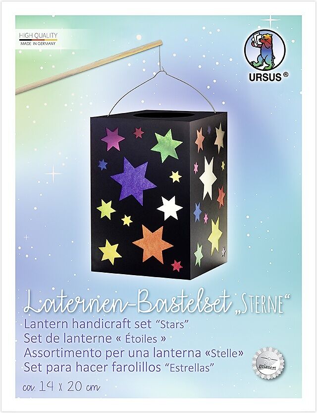 Set enthält Materialien zum Basteln einer Laterne (Breite: 14 cm, Höhe: 20 cm, Tiefe: 14 cm). - "Made in Germany" 1 Laternen-Rohling, 1 Laternendeckel und -boden (Fotokarton, 300 g/m, schwarz), 1 Laternentragebügel und 11 Blatt Transparentpapier (42 g/m, sorti...