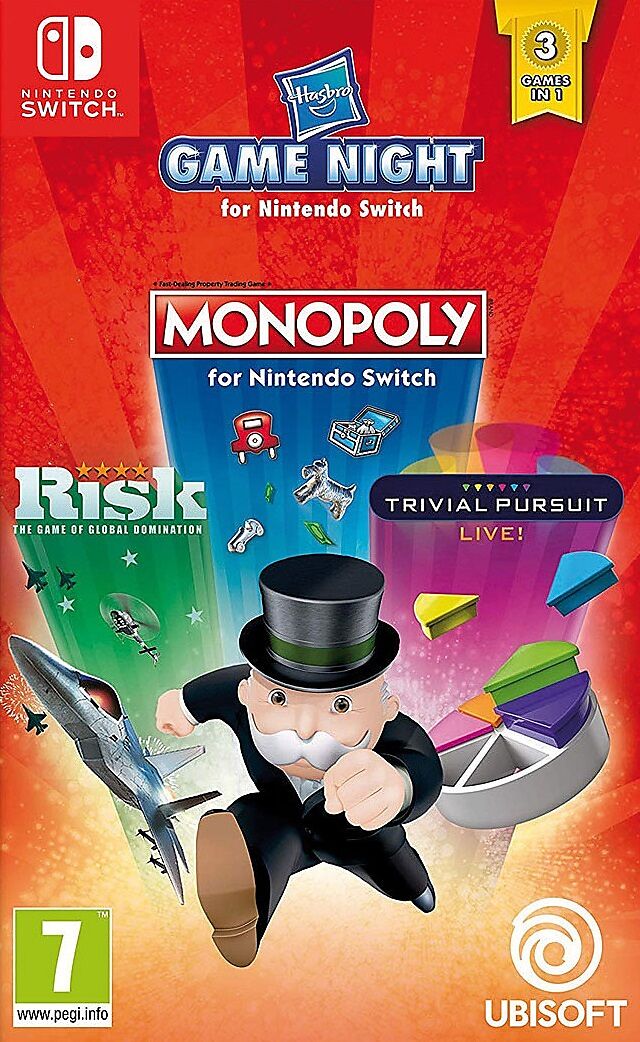 Erleben Sie stundenlangen Spass mit der Hasbro Game Night für Nintendo Switch! Drei Ihrer Lieblingsspiele - MONOPOLY für Nintendo Switch, TRIVIAL PURSUIT Live! und RISK sind nun für Nintendo Switch erhältlich und in dieser Edition enthalten. Ob zu Hause oder u...