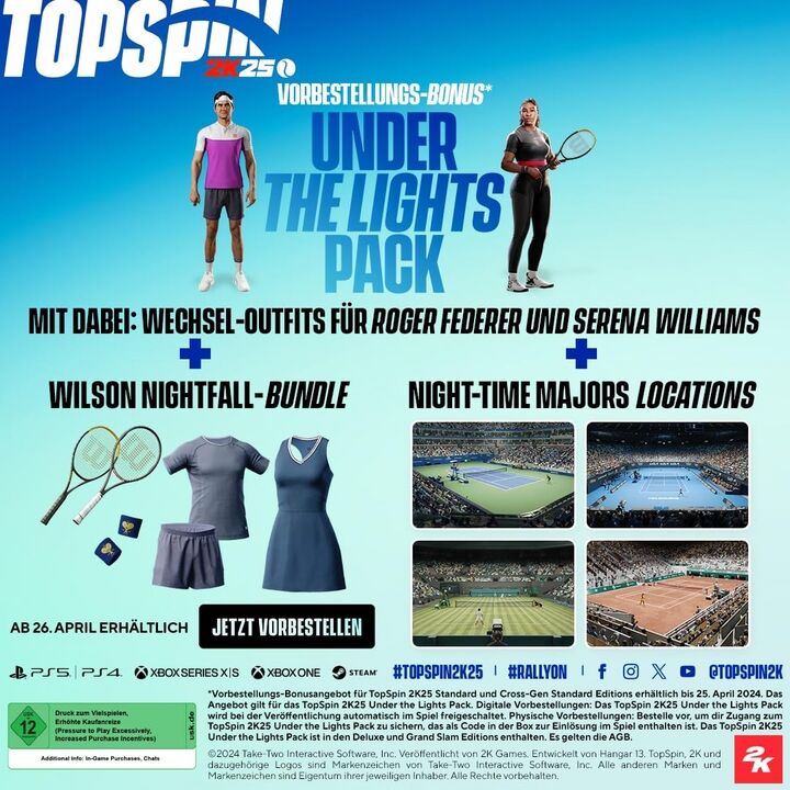 Das TopSpin-Franchise ist zurück mit TopSpin 2K25! Erlebe Legenden wie Roger Federer, Serena Williams und viele andere Profis, spannende Single-Player und Multiplayer-Modi, alle vier klassischen Grand Slams und vieles mehr! Features Gewinne den Grand-Slam dein...