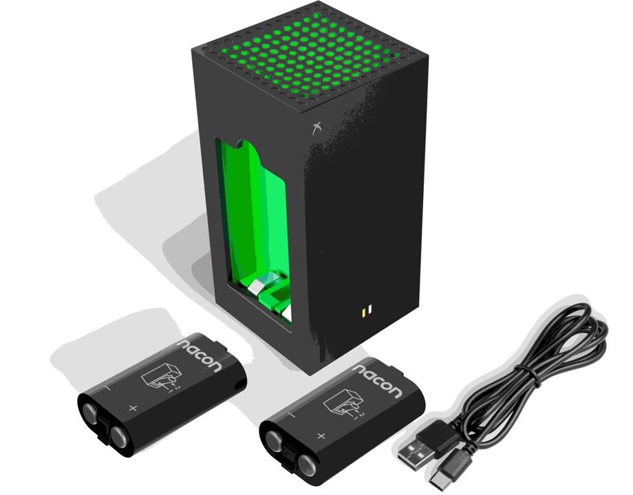 Ladegerät mit zwei externen akkus Gleichzeitiges Aufladen von zwei Akkupacks Laden Sie das erste Akkupack auf, während Sie mit dem zweiten spielen. Kompatibel mit allen Xbox-Controllern: Xbox One und Xbox Series. USB-A auf USB-C Kabel (ca. 1 m). Anzeige des Ak...