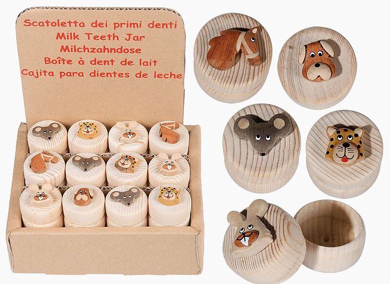 Ein schönes, kleines Döschen aus Holz für hygienisches Aufbewahren der kleinen Milchzähne des stolzen Nachwuchses. Ein fröhlicher Tierkopf schmückt den Deckel. Fünf verschiedene Motive: Pferd, Hund, Hase, Maus oder Tiger. Motiv nicht wählbar, kommt nach Lagerv...