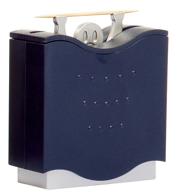 Ziehe das Gehäuse nach oben, schon erhältst du einen Zahnstocher Platz für ca. 100 Zahnstocher Material: ABS Masse: 13 x 12 x 5 cm