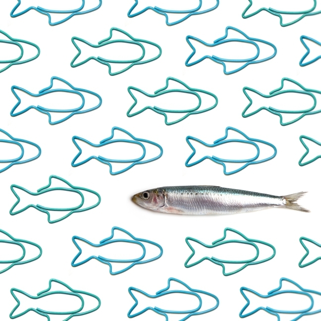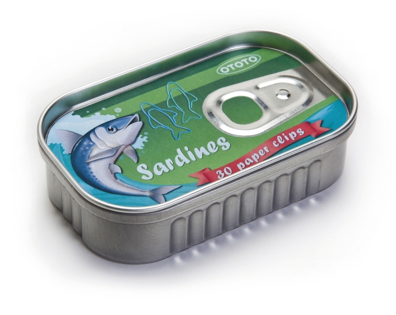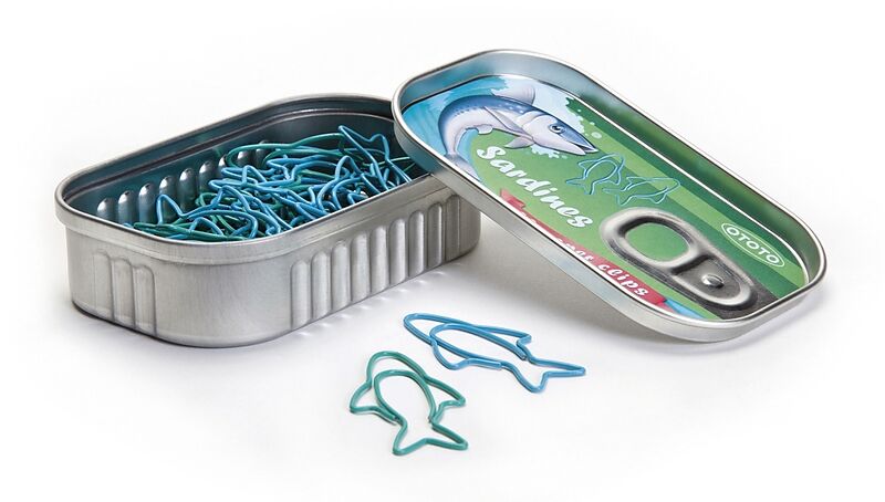 Grüne und blaue kleine Fische machen sich als Büroklammern nützlich. Und wer mit der Arbeit fertig ist, schwimmt zurück in die Sardinenbüchse, zu den anderen. Das perfekte Überraschungsgeschenk an einen Fischer! Er wird sich über diese originelle Idee mega fre...