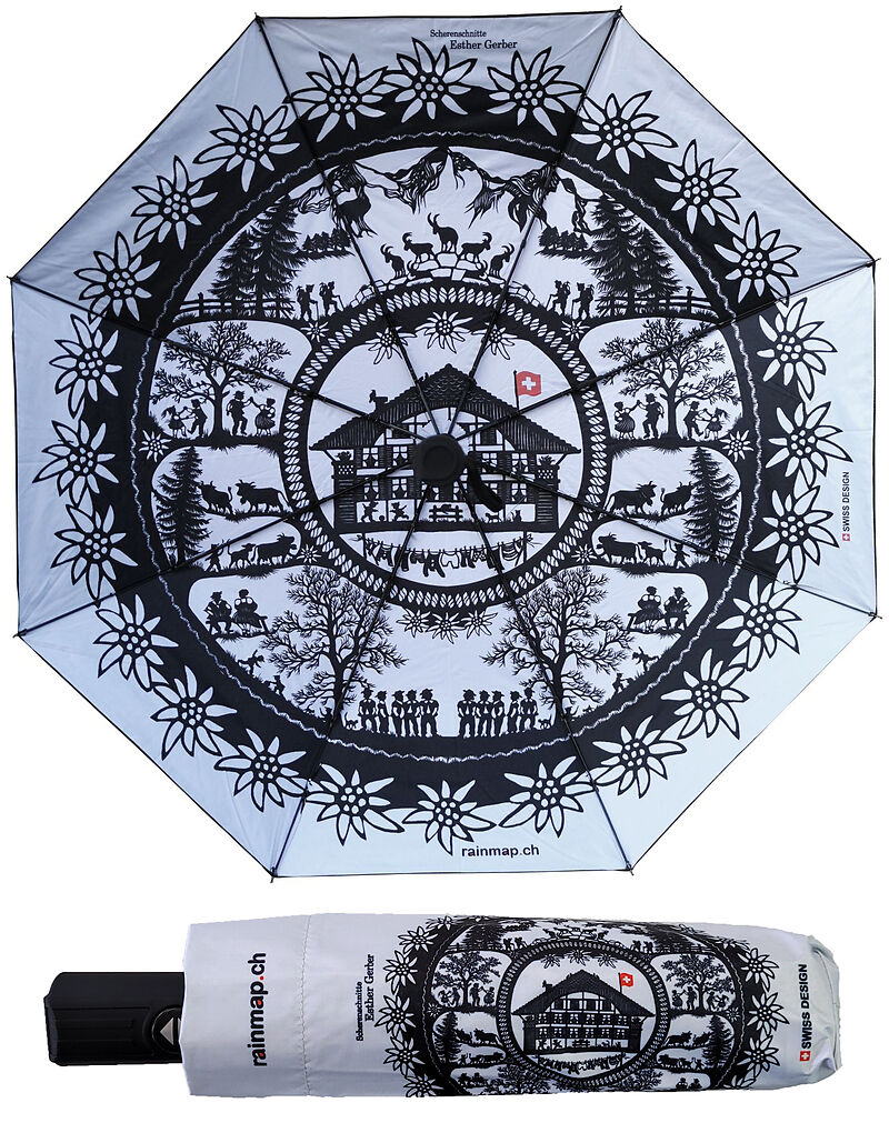 Hochwertiger Taschenschirm kompakt und windsicher Aussenfarbe schwarz und innen mit einem traditionellen Motiv ausgestattet Auf und zu Automatik Schirmhülle mit dazu passendem Motiv