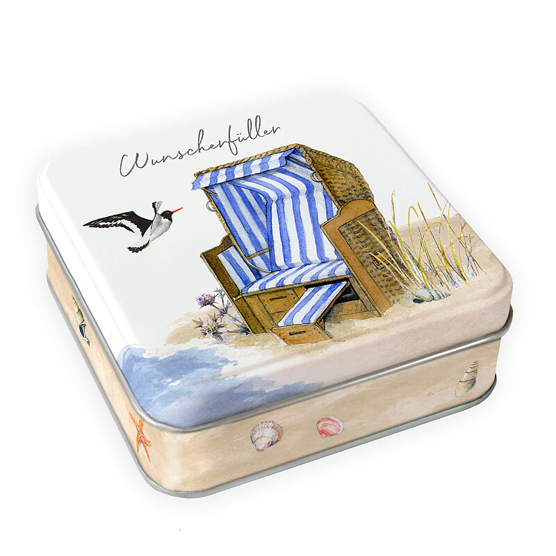 10 x 10 x 3.5 cm aus Blech Schöne Dose die vielseitig einsetzbar ist. Ob als Verpackung für ein kleines Geschenk oder als Aufbewahrung für Krimskrams, sie passt einfach immer.