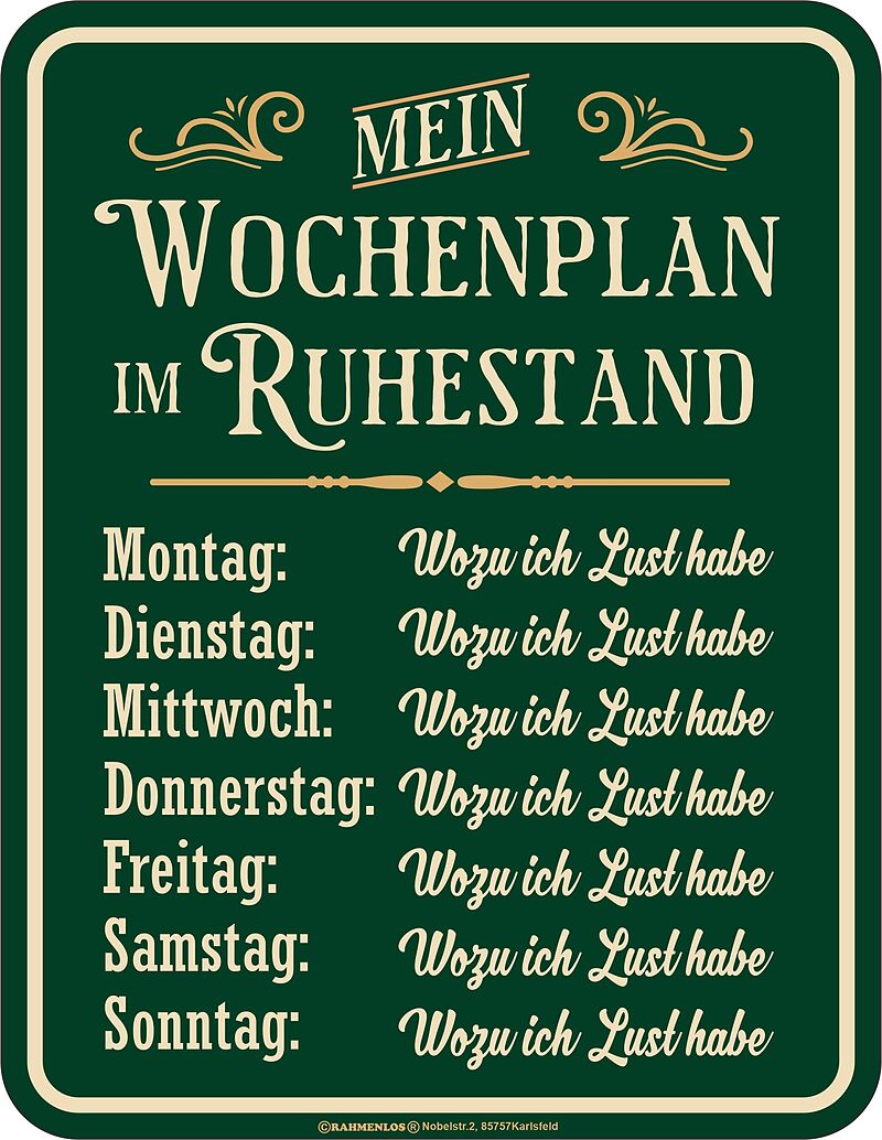 Wochenplan Ruhestand Blechschild