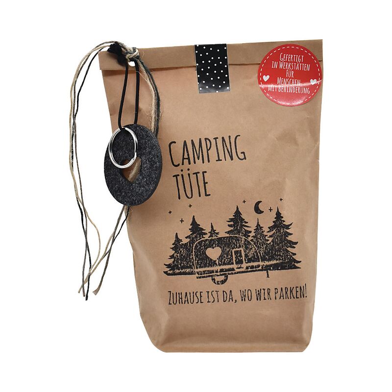 Zurück zur Natur und rein in das Abenteuer. Kleine Wundertüte für alle Camper und Zeltliebhaber mit nützlichen Utensilien. ÝZuhaus ist da wo wir parkenÝ ist eine gute Devise für alle Outdoor Fans. Inhalt: Spülschwamm, Notfallkarte Erste Hilfe, Schlüsselanhänge...