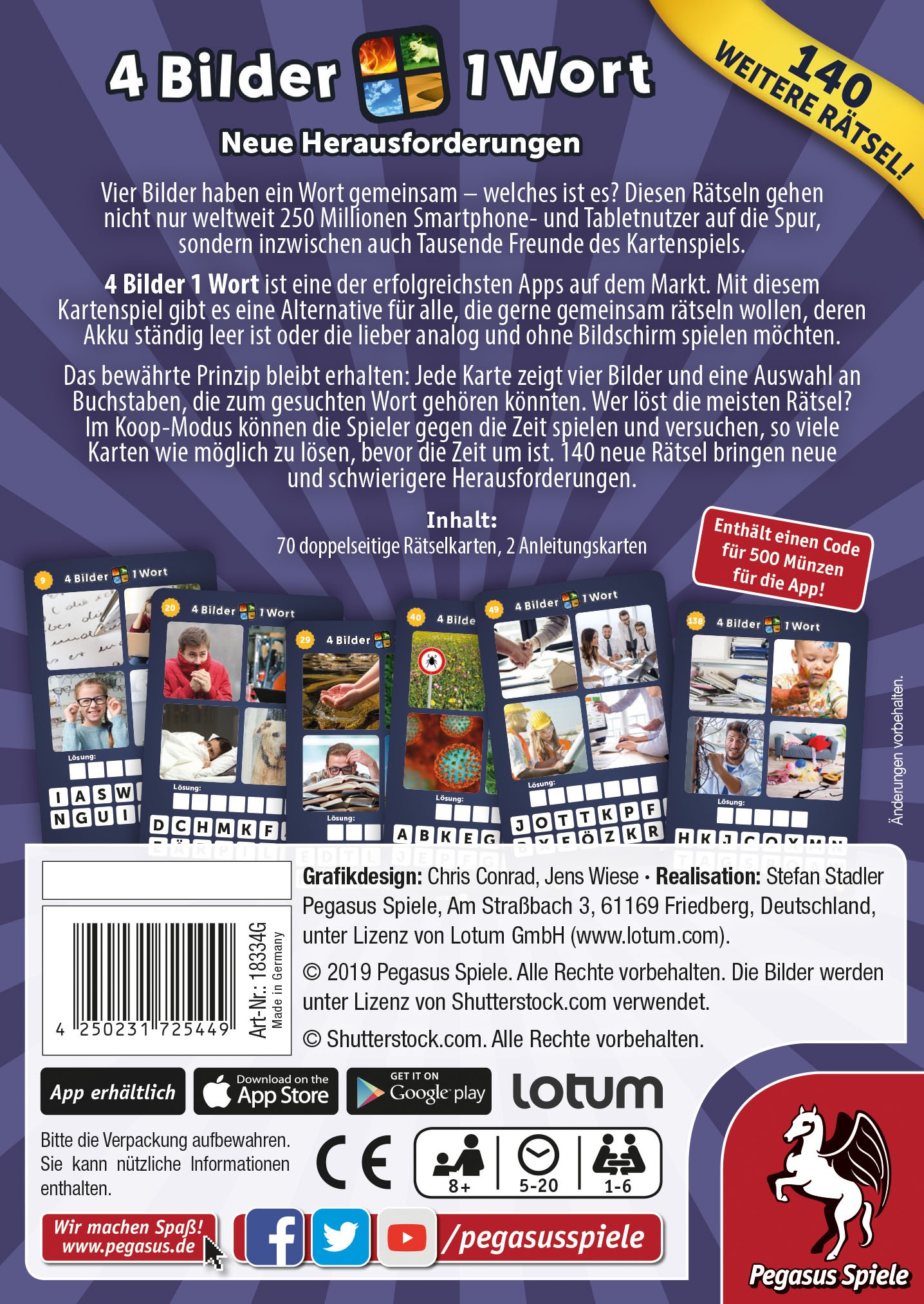 Vier Bilder haben ein Wort gemeinsam welches ist es? Diesem Rätsel können Spieler seit 4 Bilder 1 Wort Das Kartenspiel nicht nur in der gleichnamigen App, sondern auch gemeinsam am Spieltisch nachgehen. Mit 4 Bilder 1 Wort Neue Herausforderungen kommen nun 140...